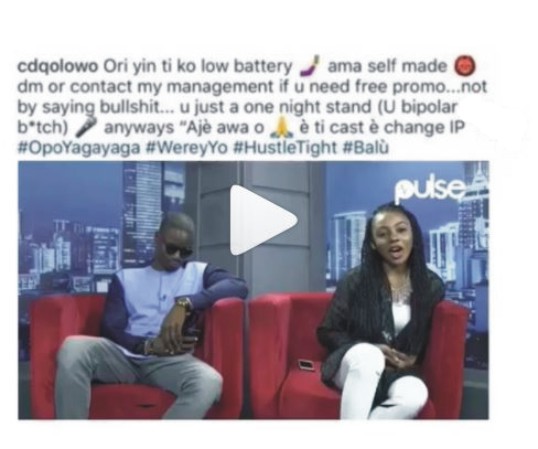 Speaking to Pulseng in an interview, she stated it clear that CDQ is an asshole for calling her a one night stand, she further said, CDQ did not even see her Vagina. Watch video below