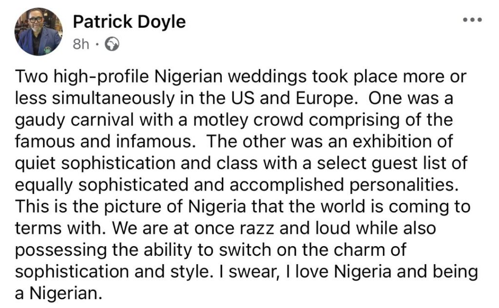 Media personality, Patrick Doyle, has taken to social to write about the uniqueness of two high profile Nigerian weddings that took place in US and Europe.