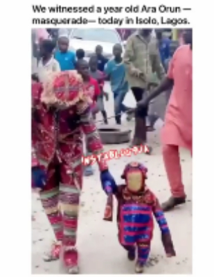 A one-year-old Ara Orun masquerade was spotted in Isolo, Lagos, IgbereTV reports.