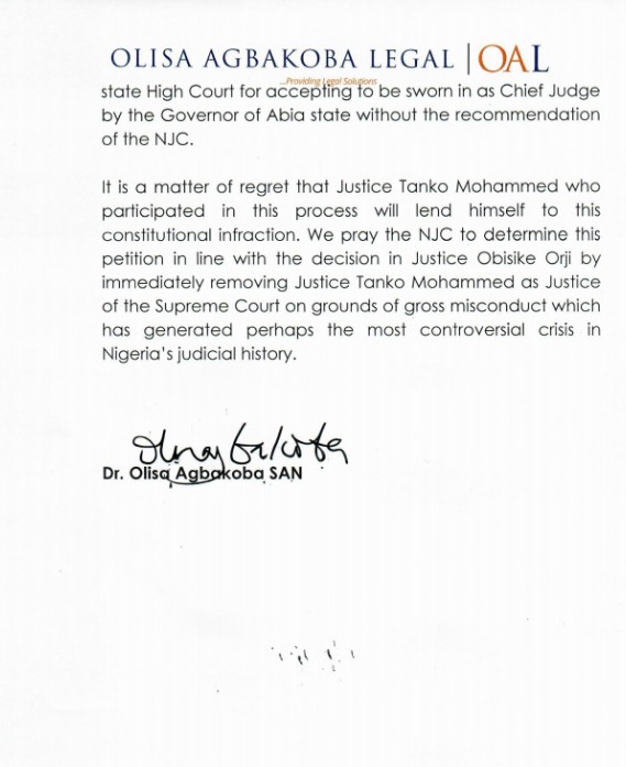 “It is a matter of regret that Justice Tanko Mohammed who participated in this process will lend himself to this constitutional infraction. We pray the NJC to determine this petition in line with the decision in Justice Obisike Orji by immediately removing Justice Tanko Mohammed as Justice of the Supreme Court on grounds of gross misconduct which has generated perhaps the most controversial crisis in Nigeria’s judicial history.”