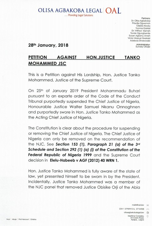 A senior advocate of Nigeria, Olisa Agbakoba SAN, has written a petition against the acting Chief Justice of Nigeria, Justice Tanko Muhammed.
