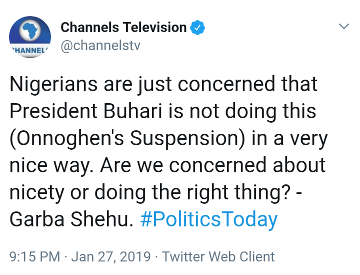 Nigerians are just concerned that President Buhari is not doing this (Onnoghen’s Suspension) in a very nice way. Are we concerned about nicety or doing the right thing? – Garba Shehu.