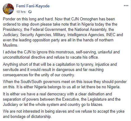 The former Aviation Minister, Femi Fani-Kayode, has continued to react to the decision of the Federal government to arraign the Chief Justice of Nigeria, Justice Walter Onnoghen, on Monday January 14th over his alleged refusal to declare his assets before and after he assumed office.