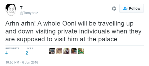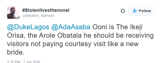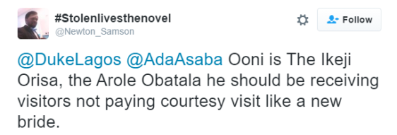 Over the weekend, Nigerian footballer Obafemi Martins received a visit from His Royal Majesty, the Ooni of Ife, Oba Adeyeye Enitan Ogunwusi at his home in Lagos State. Obafemi shared a video of the Yoruba Monarch seated in his home during the visit and Nigerians seem to have an issue with this. They feel someone so important should not be paying just anyone a visit but rather be visited at his Palace in Ile Ife, Osun State. See reactions from twitter as you continue. Guess people forget he was a regular dude before he became royalty…anyway, read the tweets and tell us what you think..