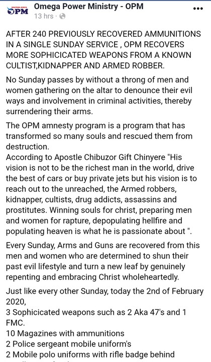 AFTER 240 PREVIOUSLY RECOVERED AMMUNITION IN A SINGLE SUNDAY SERVICE , OPM RECOVERS MORE SOPHISTICATED WEAPONS FROM A KNOWN CULTIST,KIDNAPPER AND ARMED ROBBER.