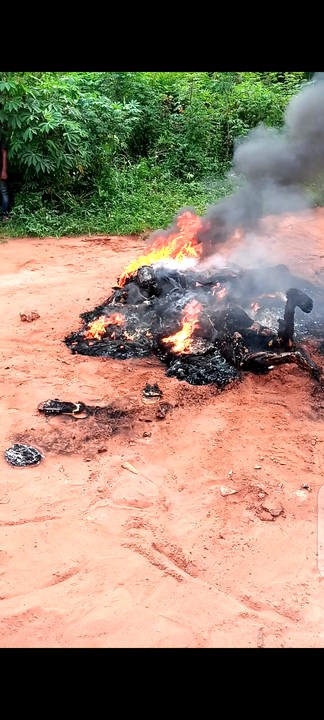 Three suspected armed robbers were caught by security operative in Orlu, they were burnt after the confessed they went on a successful mission early this morning, it was a horrific moment as villagers gathered to witness the incident