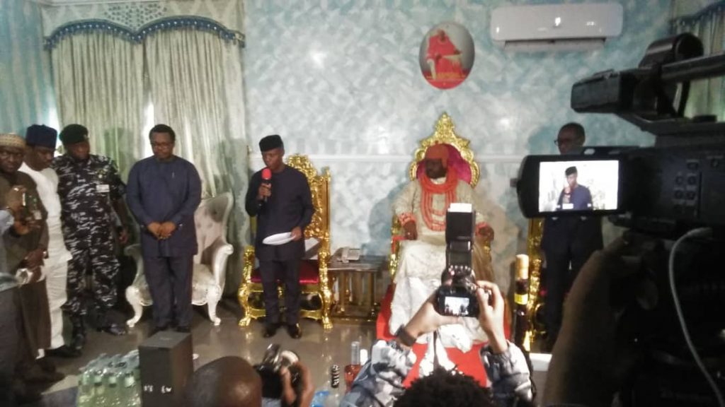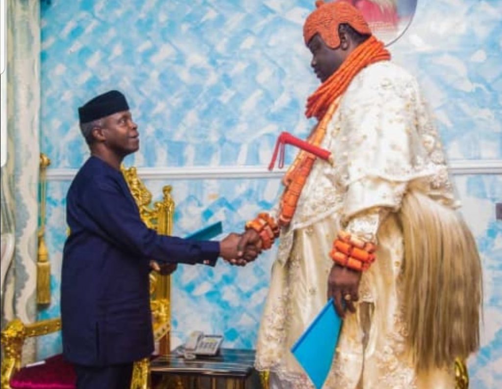 This picture of VP Yemi Osinbajo was taken on his courtesy visit to HRM Capt Joseph Timiyan, the Ebenanowean of Ogulagha Kingdom, an oil producing community in Delta State, to Commission 20.5km Yokri, Sokebolou, Obotebe 1, Obotebe 2 Roads in Burutu Local Government Area of the State.