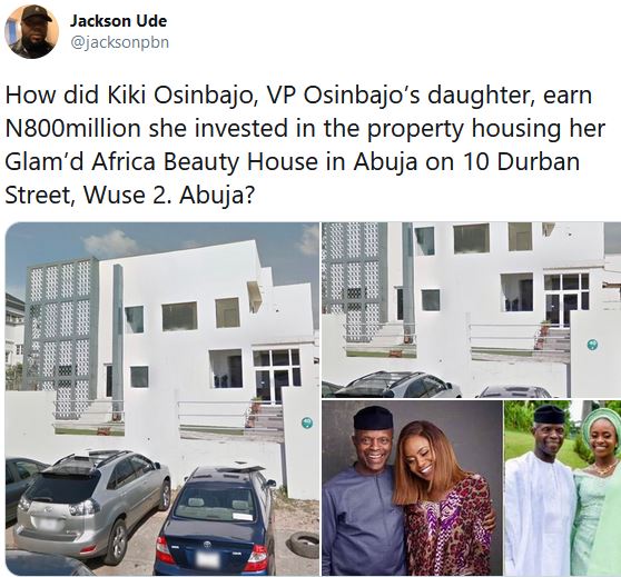 “How did Kiki Osinbajo, VP Osinbajo’s daughter, earn N800million she invested in the property housing her Glam’d Africa Beauty House in Abuja on 10 Durban Street, Wuse 2. Abuja?” he tweeted
