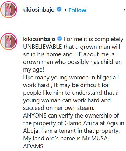 Taking to her Instagram page to react, Kiki described the allegation as a lie. She stated that she is a tenant in the property where she runs her business.