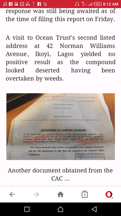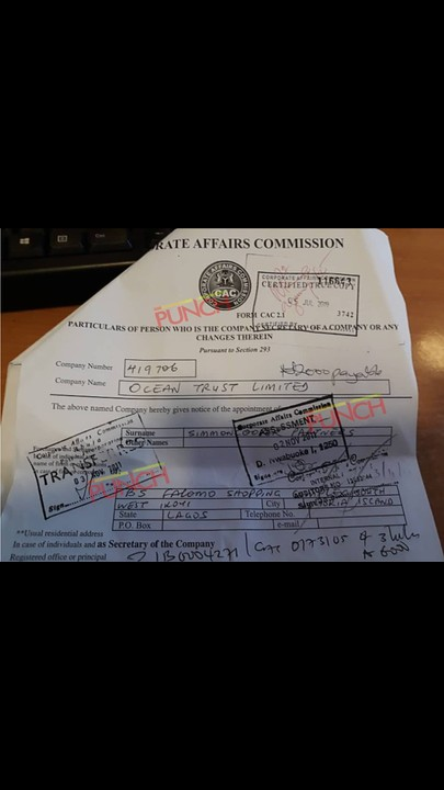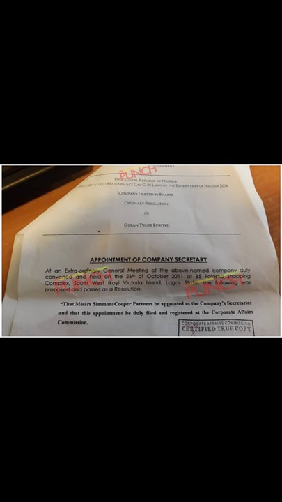 Ocean Trust Limited, which was accused of being a conduit for diversion and laundering of funds by Alpha Beta, listed Simmons Coopers as its company secretary, documents exclusively obtained from the Corporate Affairs Commission by Saturday PUNCH showed.