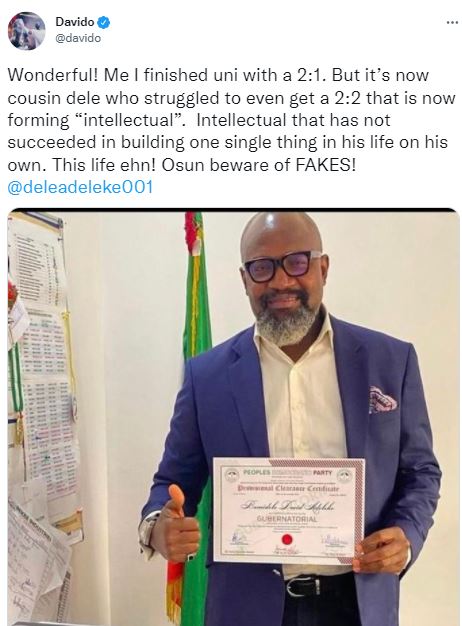 This life ehn! Osun beware of FAKES! @deleadeleke001 This comes as the race for the Osun 2022 election comes closer. Bamidele is hoping to contest against his relative, Ademola Adeleke who is Davido’s uncle.