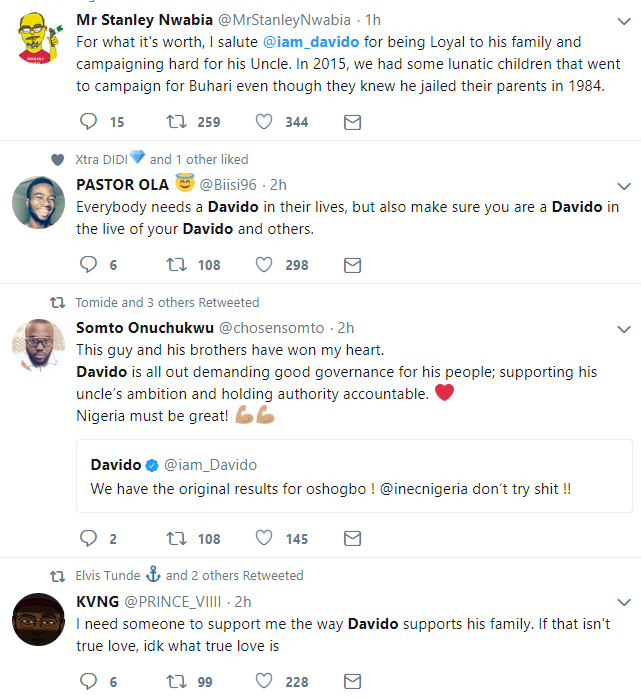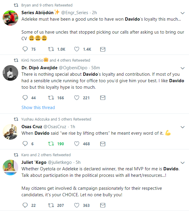 Nigerians have now taken to twitter to praise Davido for the support he has shown his uncle, the PDP candidate, Senator Ademola Adeleke, during and after his campaign.