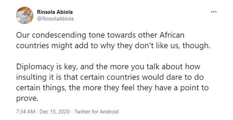 ”Our condescending tone towards other African countries might add to why they don’t like us, though. Diplomacy is key, and the more you talk about how insulting it is that certain countries would dare to do certain things, the more they feel they have a point to prove.”