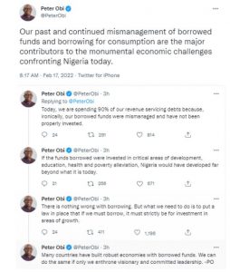 In a thread posted on his Twitter handle this morning, Obi who was one-time Governor of Anambra State, said Nigeria now uses 90 percent of its revenue to service loans because the ones borrowed in the past were mismanaged.