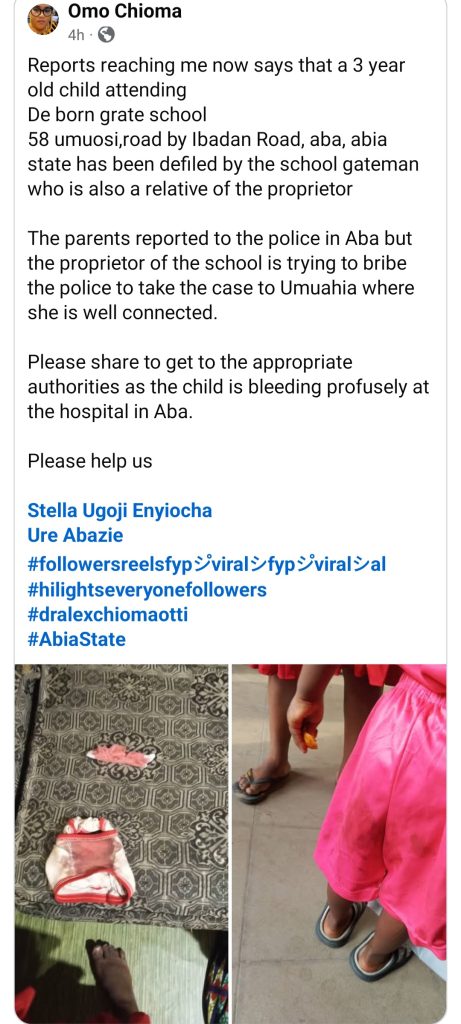 Meanwhile Demi Care Foundation reacted to the incident, writing: “R@pe of a 3 year old baby by a school gateman! Where is Abia state government? This should not be swept under the carpet.”