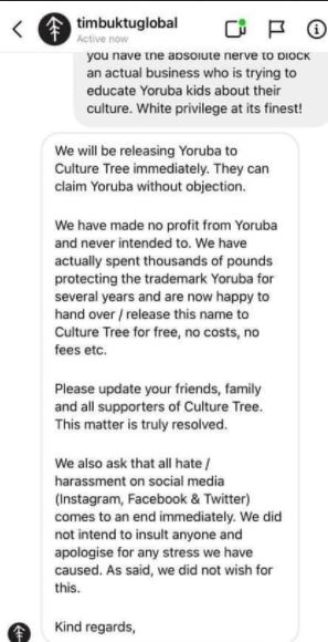 Timbuktu Global, an outerwear clothing retailer owned by two White-British people from the North of England, trademarked Yoruba, opposing anyone else from using it, not even Yoruba people.