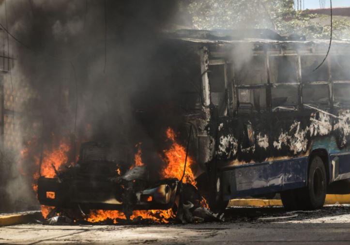 Footage showed the burnt-out bus charred and gutted by the blaze, surrounded by firefighters and emergency crews who had rushed to the scene which was sealed off.