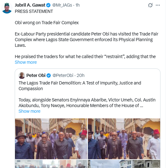”Today, alongside Senators Enyinnaya Abaribe, Victor Umeh, Col. Austin Akobundu, Tony Nwoye, Honourable Members of the House of Representatives, Segun Sowonmi, George Adegeye, Labour Party Lagos State Gubernatorial candidate, Gbadebo Rhodes-Vivour and coordinator of the Obidient Movement Tanko Yunusa, we visited the site of the demolished ASPAMDA Market at the Trade Fair in Lagos, where plazas were pulled down despite traders having obtained the requisite approvals.