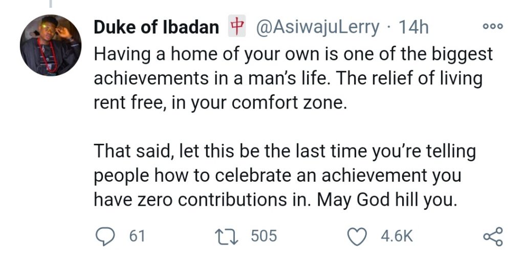 “You actually don’t have any reason for this tweet. You’re just bitter. Owning your own home is a very big achievement. One of the biggest achievement any man/woman can be proud of.”