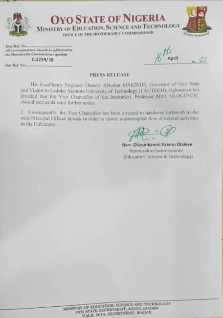 According to the document below, Professor Michael Ologunde has been asked to step aside till further notice by the Visitor to the institution, Governor of Oyo State, @seyiamakinde