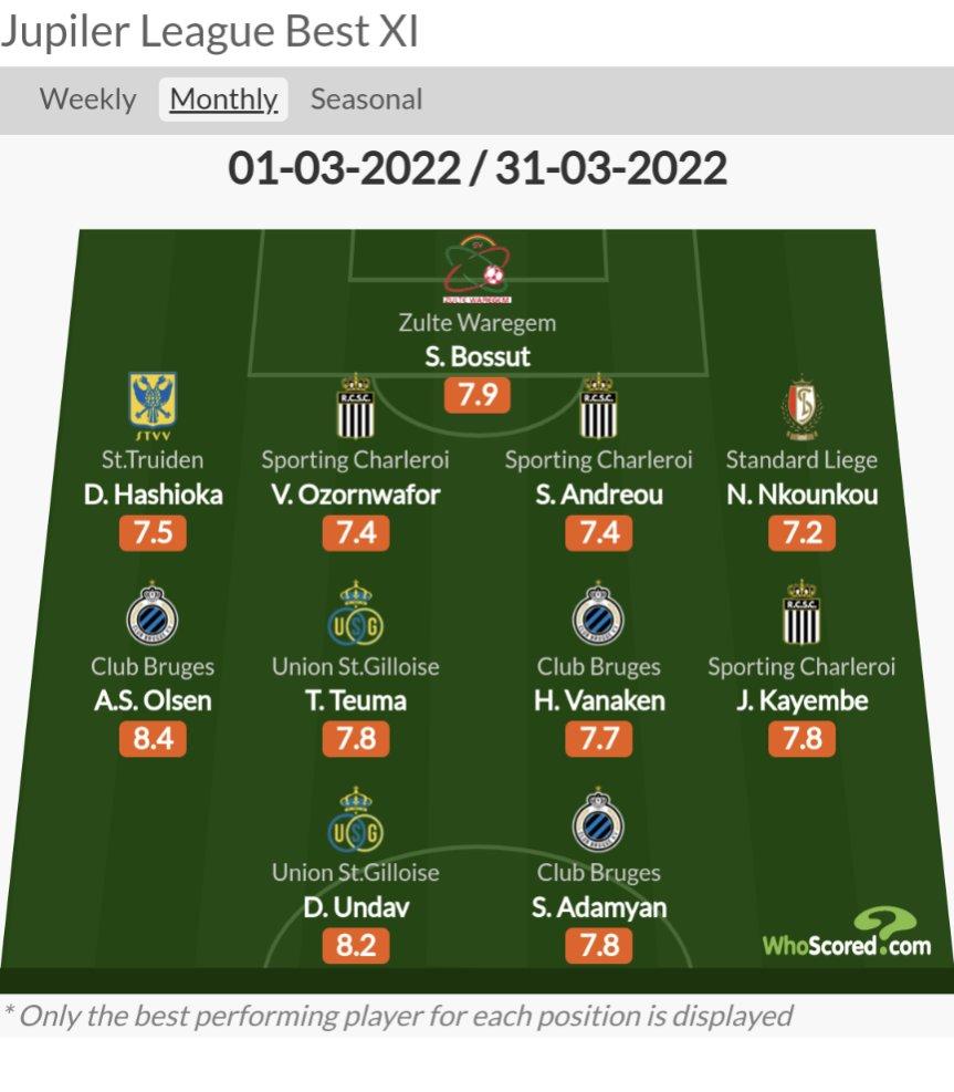 Sporting Charleroi Nigerian defender, Valentine Ozornwafor,has been named in the Belgian League Team of the Month for March.