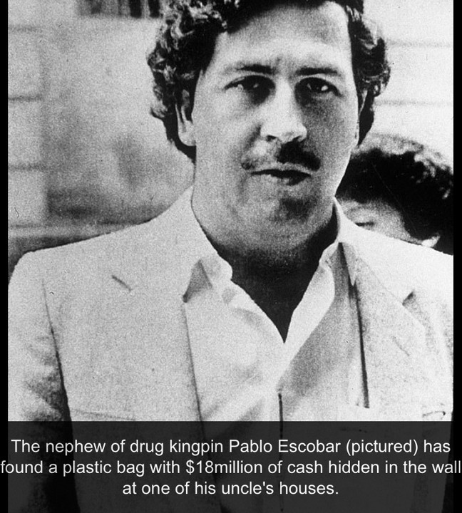 The nephew of drug kingpin Pablo Escobar has found a plastic bag with £14million of cash hidden in the wall at one of his uncle’s houses.