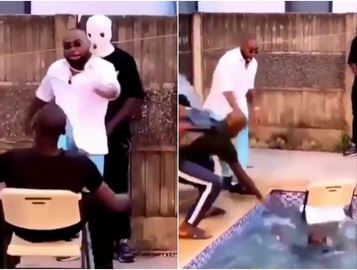 Panic As Man Is Seen Struggling To Come Out After Davido Pushed Him Inside Pool During Video Shoot