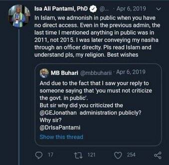 Pantami in his response said, “In Islam, we admonish in public when we have no direct access. Even in the previous administration, the last time I mentioned anything in public was in 2011, not 2015.”