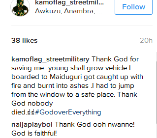“Thank God for saving me.young shall grow vehicle I boarded to Maiduguri got caught up with fire and burnt into ashes .I had to jump from the window to a safe place.