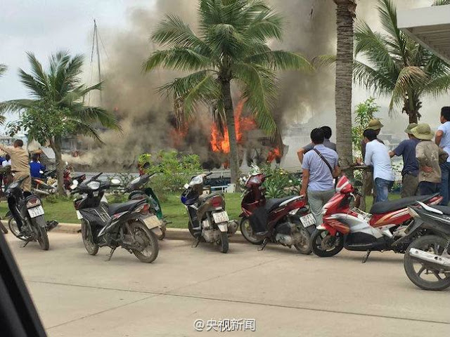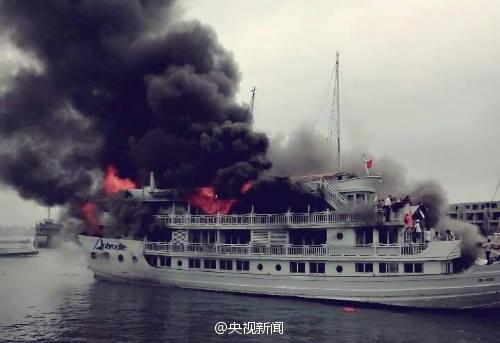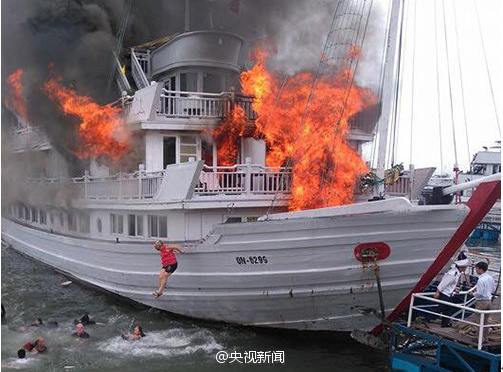 A luxury boat sank after catching fire when docking in a pier in Vietnam, Friday. Photos show that passengers jumping off the boat to escape.