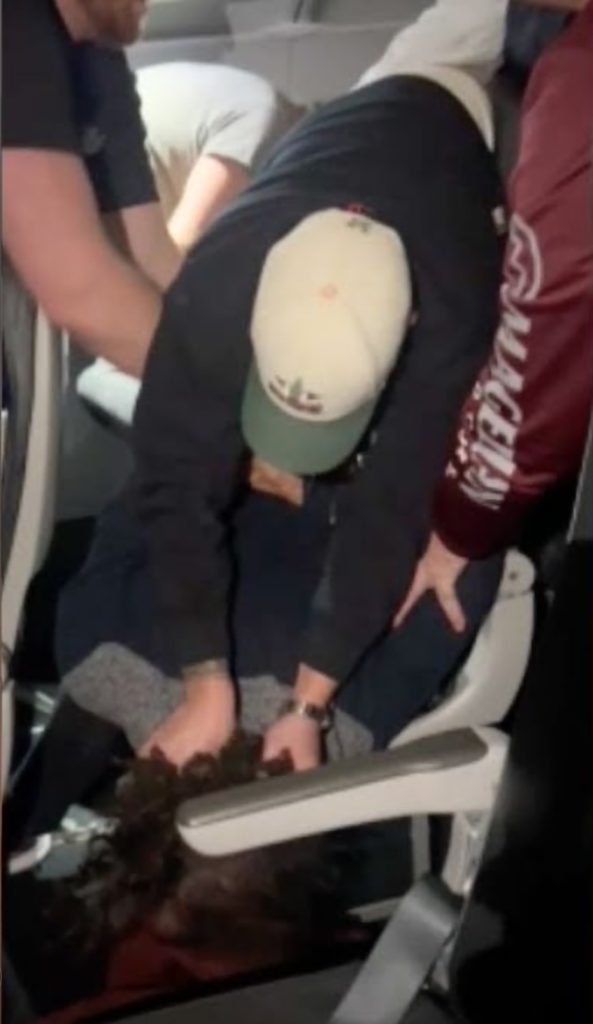 In a video filmed by Clark, several passengers are restraining the man in the aisle with zip ties and a shoelace.