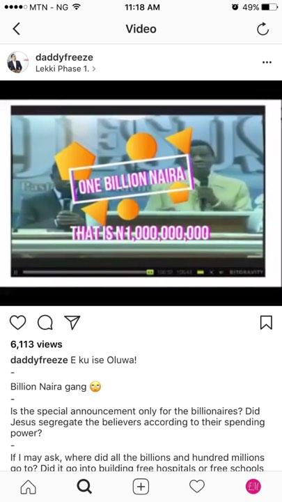 Yea, You got it right, 1 billion Naira! RCCG Pastor Adeboye is dragging lots to criticism to himself after he was videod during a recent church service asking his members to donate N1billion naira, And as expected Daddy Freeze shared the video on his page reacting to it, calling it the highest form of duping, Its already enough that people are worried about paying tithes, and this just even adds to the fire, cos people will even be more scared, to pay offering, talk more of tithes..