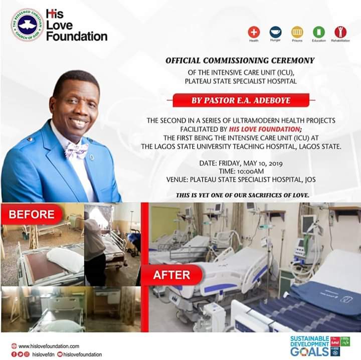 This Weekend , PASTOR E. A. ADEBOYE, The General Overseer of The Redeemed Christian Church Of God will be commissioning an Intensive Care Unit at the Plateau Specialist Hospital, Jos