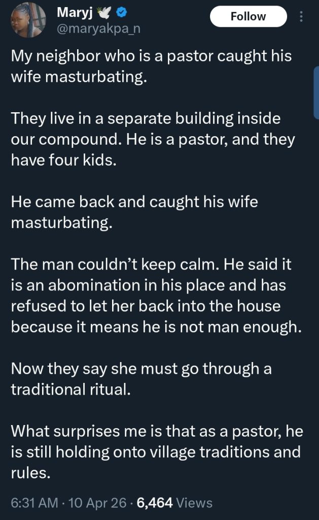 A lady has sparked intense online debate after sharing a disturbing account about her pastor-neighbour and his wife, leading to mixed reactions across social media.