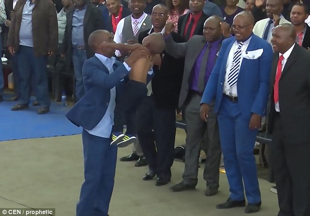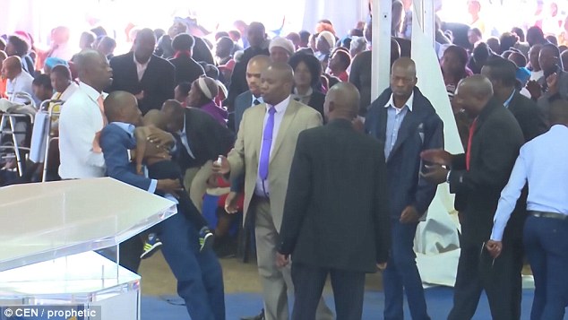 He walks around the church with the boy during a service led by prophet Shepherd Bushiri when he suddenly falls towards the floor.