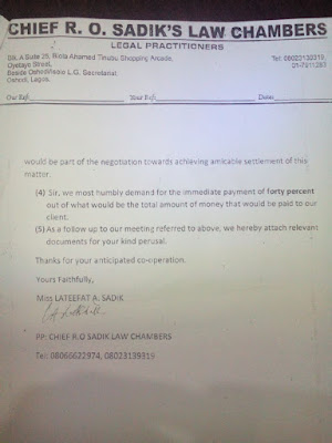 One of the letters, sighted by SaharaReporters, was dated 7 July and signed by one Miss Lateefa Sadik for Mr. Sadik’s chambers. The letter recalled a meeting held between the legal firm and MFM representatives led by one Pastor Alewi.