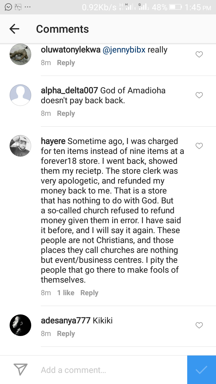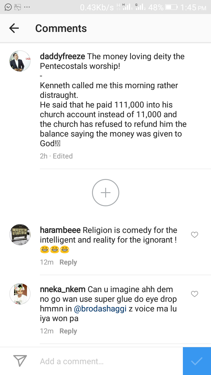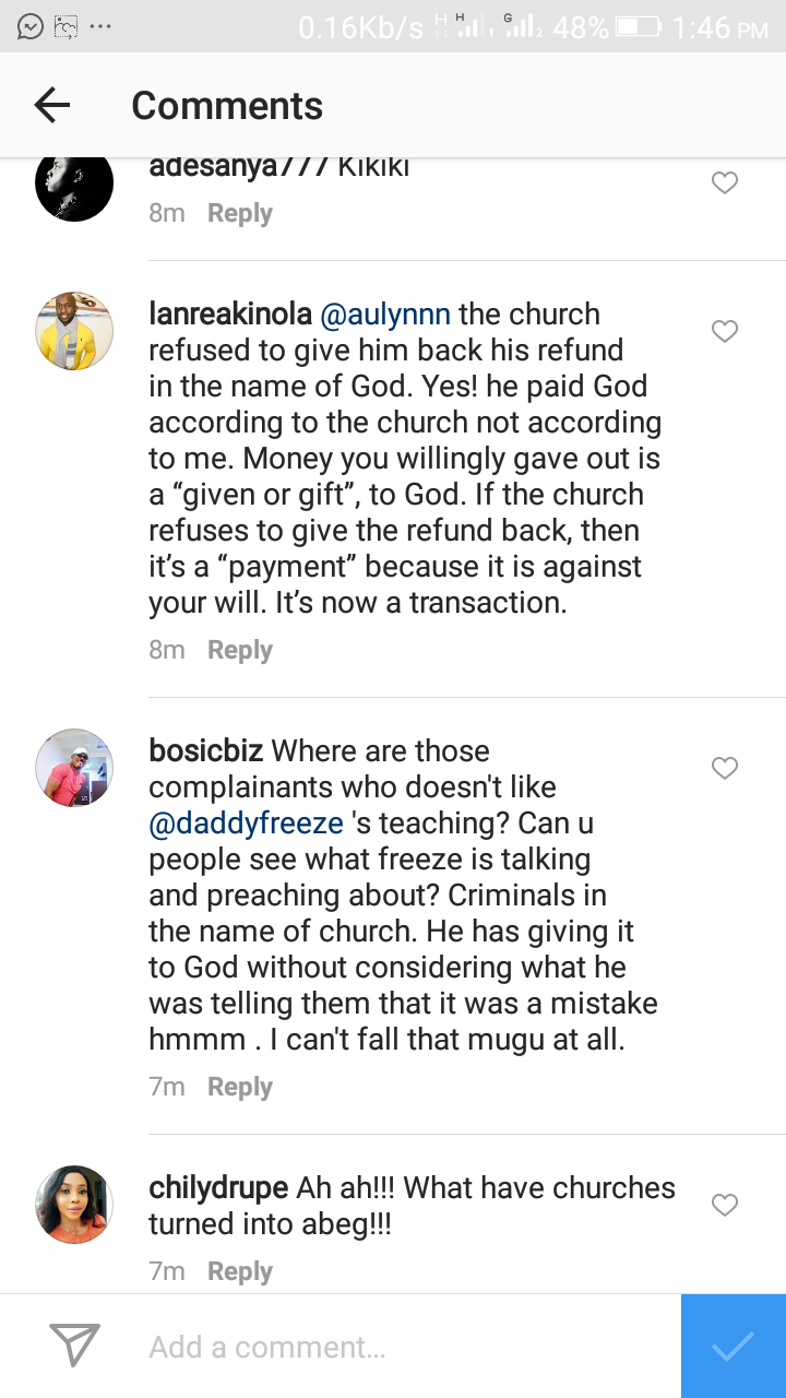 Daddy freeze reveals on his Instagram page that one kenneth, who overpaid his tithe by #100, 000, reported that his pastor has rebuffed all his demands for a refund.