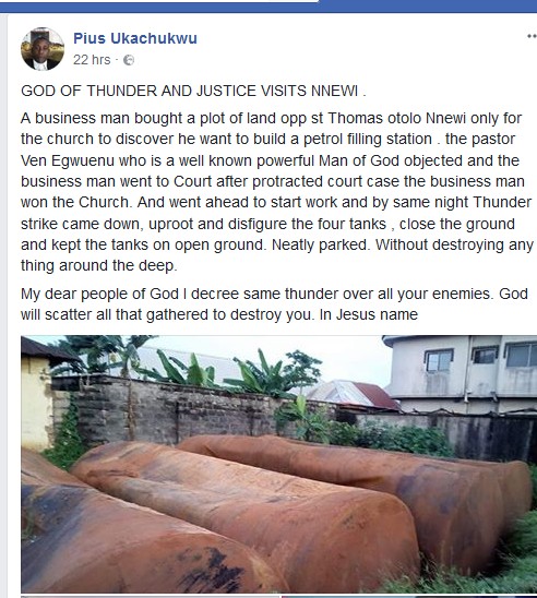 It was claimed that thunder struck the same day which work started on the land and ”uprooted” the four storage tanks from the ground without destroying any other thing.