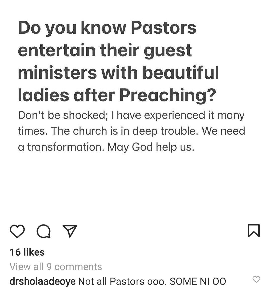 Adeoye, the founder of Lighthouse Church, wrote on Instagram: “Do you know Pastors entertain their guest ministers with beautiful ladies after preaching?