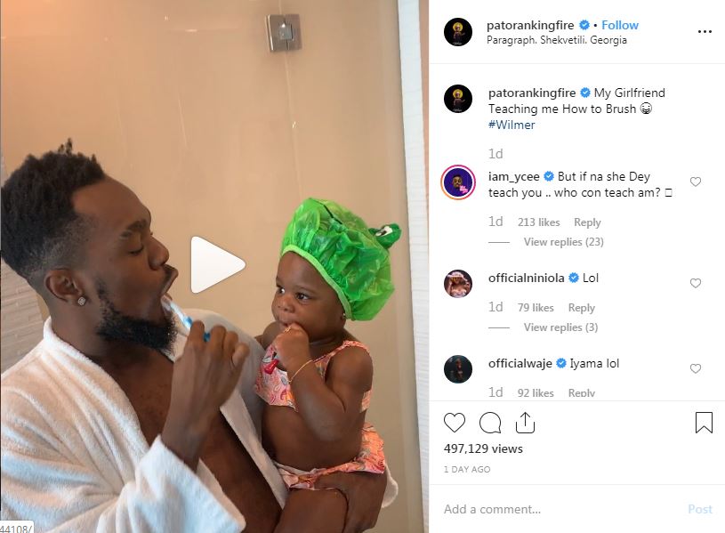 The Nigerian Singer, Patoranking and his Little daughter pictured brushing their teeth while in Georgia, he captioned the photo “My Girlfriend Teaching me How to Brush �”