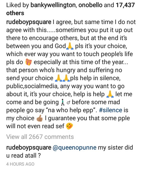 Early this morning some Nigerian fans went on Instagram to blast Paul okoye aka Rudeboy Psquare for indirectly calling out to Williams Uchemba saying he was wrong to have shown off his work of charity to the handkerchief seller on Instagram as he termed it as ,”feeding your own ego”,see what Paul okoye wrote,his fans comment and his reaction;