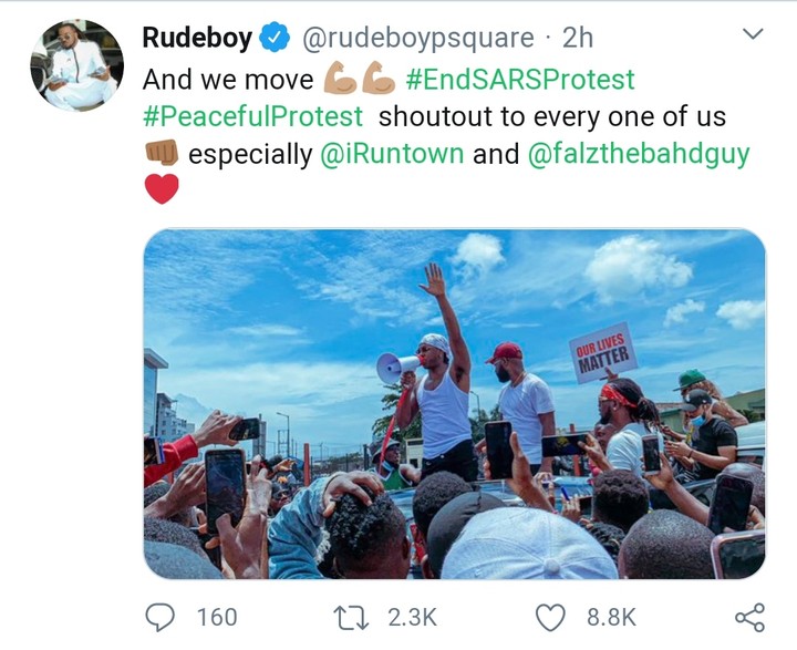 Rudeboy, 38, tweeted saying: “And we move #EndSARSProtest #PeacefulProtest shoutout to every one of us especially @iRuntown and @falzthebahdguy.”