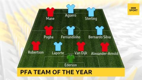 City have six of the 11, voted for by fellow players – goalkeeper Ederson, centre-half Aymeric Laporte, midfielders Bernardo Silva and Fernandinho and forwards Sergio Aguero and Raheem Sterling.