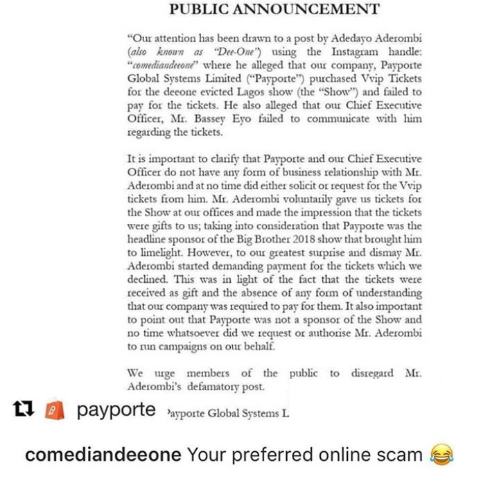 According to him, the online store is allegedly owing him N500k for tickets they bought during his show after the big brother 2018 show.