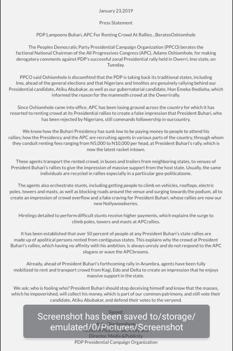 We know how the Buhari Presidency has sunk low to be paying money to people to attend his rallies; how the Presidency and the APC are recruiting agents in various parts of the country, through whom they conduit renting fees ranging from N5,000 to N10,000 per head.