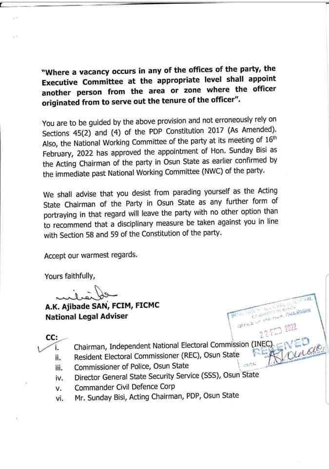 The National Working Committee (NWC) of the Peoples Democratic Party (PDP) has reaffirmed again that Sunday Bisi remained the Chairman of the party in Osun State.