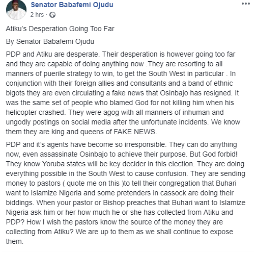 Ojudu made said this in a statement he released on his Facebook page this morning. He also accused the opposition party of giving money to Pastors so they can propogate the fake news of President Buhari’s plans to Islamize Nigeria. Read what he wrote below