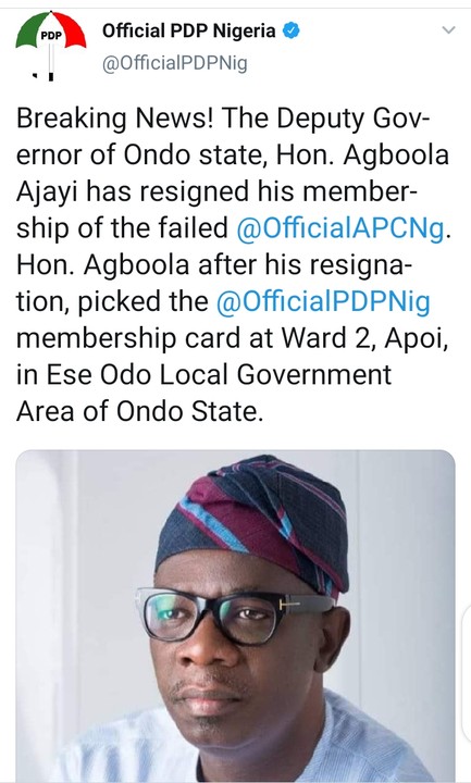 Breaking News! The Deputy Governor of Ondo state, Hon. Agboola Ajayi has resigned his membership of the failed @OfficialAPCNg. Hon. Agboola after his resignation, picked the @OfficialPDPNig membership card at Ward 2, Apoi, in Ese Odo Local Government Area of Ondo State.