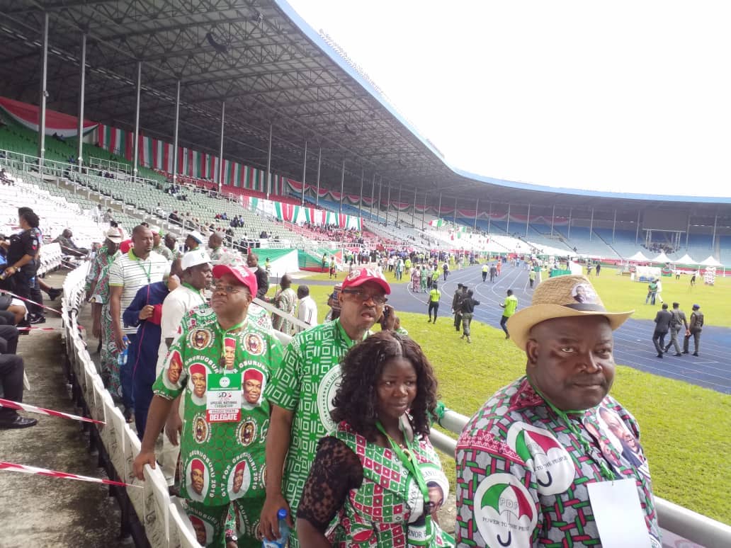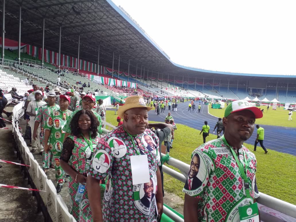 Enugu State delegates first to arrive the Adokiye Amasiemaka Stadium, Port Harcourt, Rivers State, venue of the National Convention of the Peoples Democratic Party (PDP), where the Presidential Candidate of the Party will emerge…
