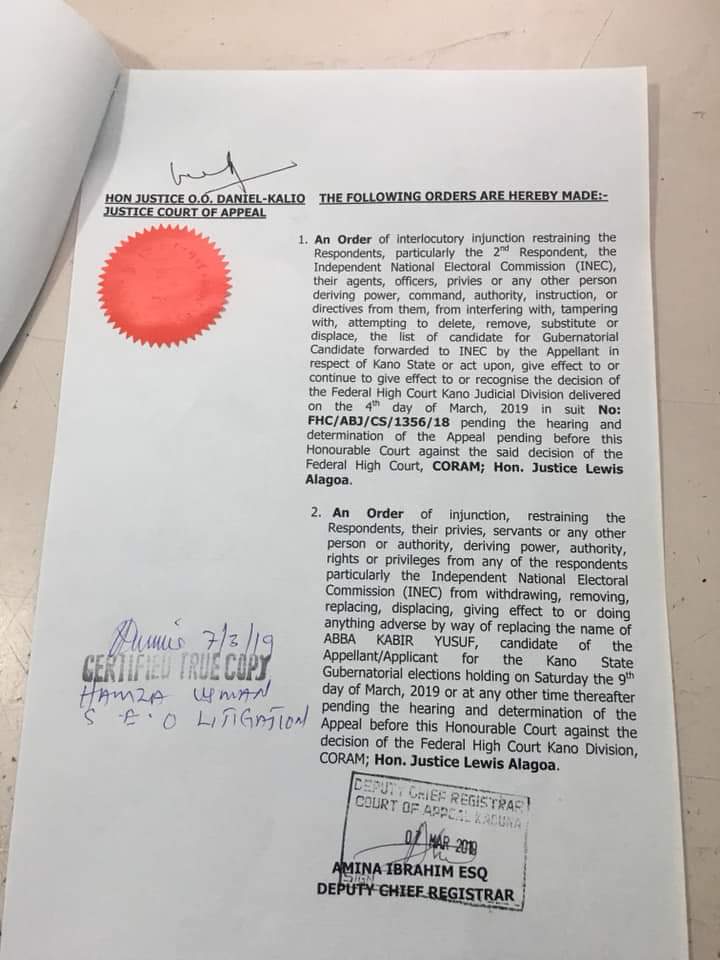The court of Appeal Kaduna has granted our prayers for the stay of Execution of the Judgment of the Federal High Court Kano nullifying the primary election of PDP Kano. PDP is still in the race.